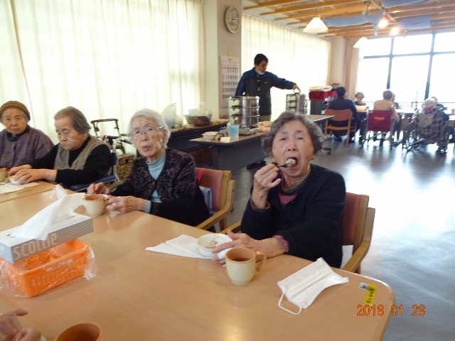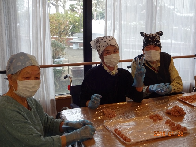 もちろん最高に盛り上がるのは④の工程です。たれを付けなくても大丈夫なようにあえて濃いめの味付けにした肉団子とご自身で作った達成感も相まって、「いつもの給食は食べきれないけど、レクだと食べちゃうのよね」とお替りされる方も多く、たくさん召し上がって頂きました。