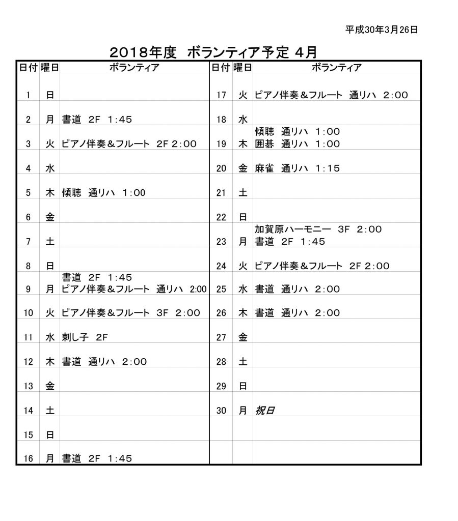 さて4月のボランティアさんの予定です。新年度もよろしくお願いいたします。