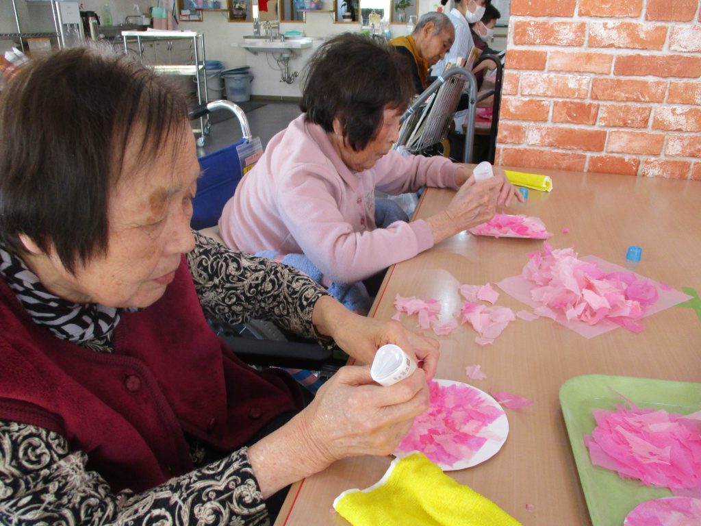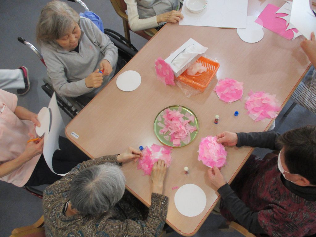 入所フロア2Fでは春に向けて、フロアも桜で満開にしようと皆様製作中です。