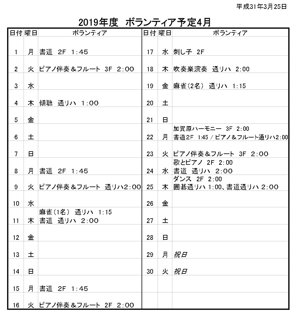 ボランティアさんよろしくお願いいたします。4月の予定です。