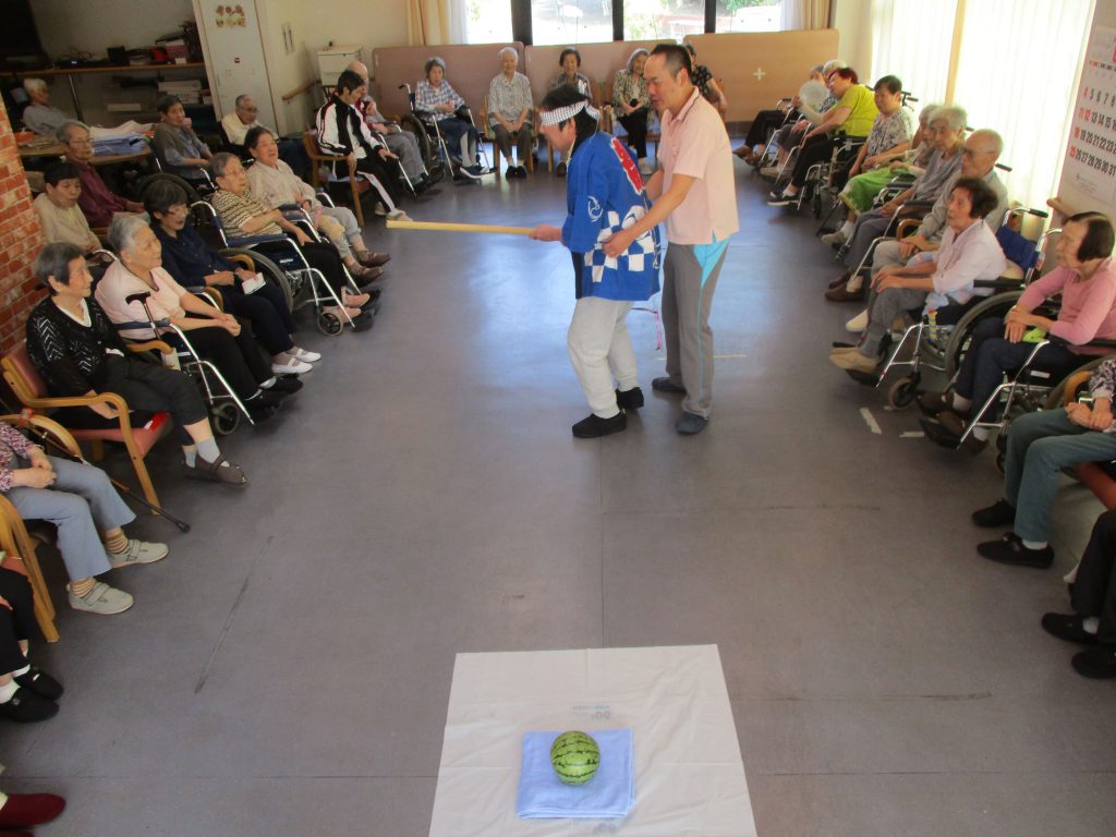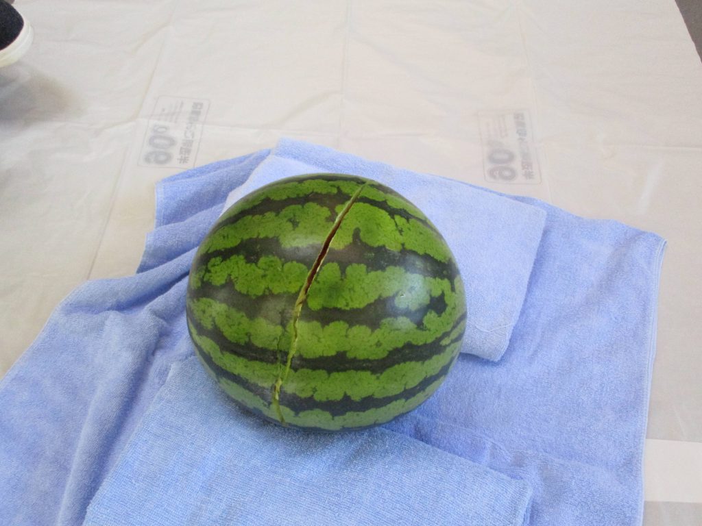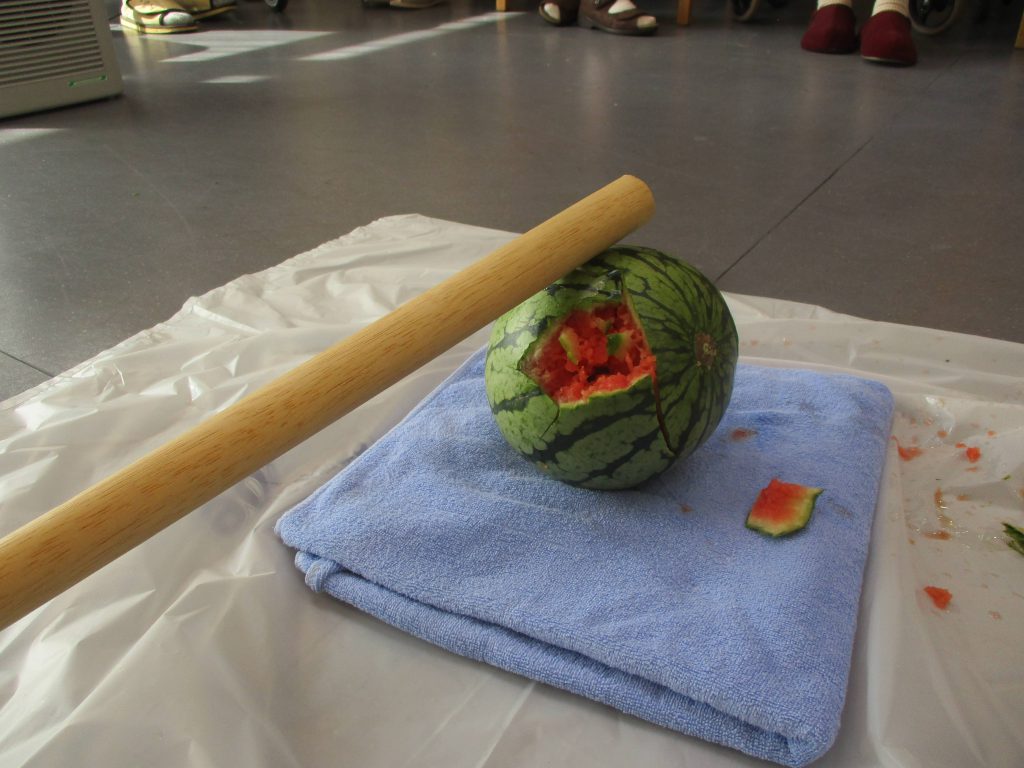へっぴり腰ながら、強力な一撃ですいかを割ってくれました!