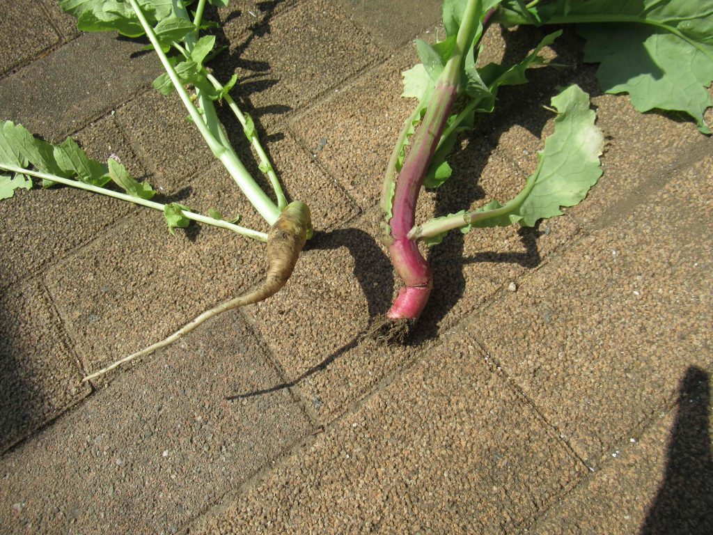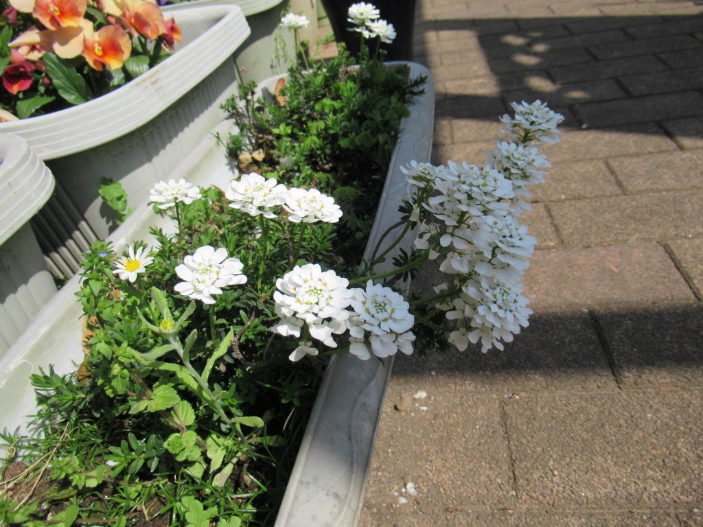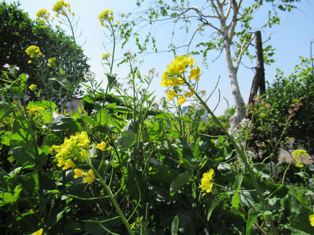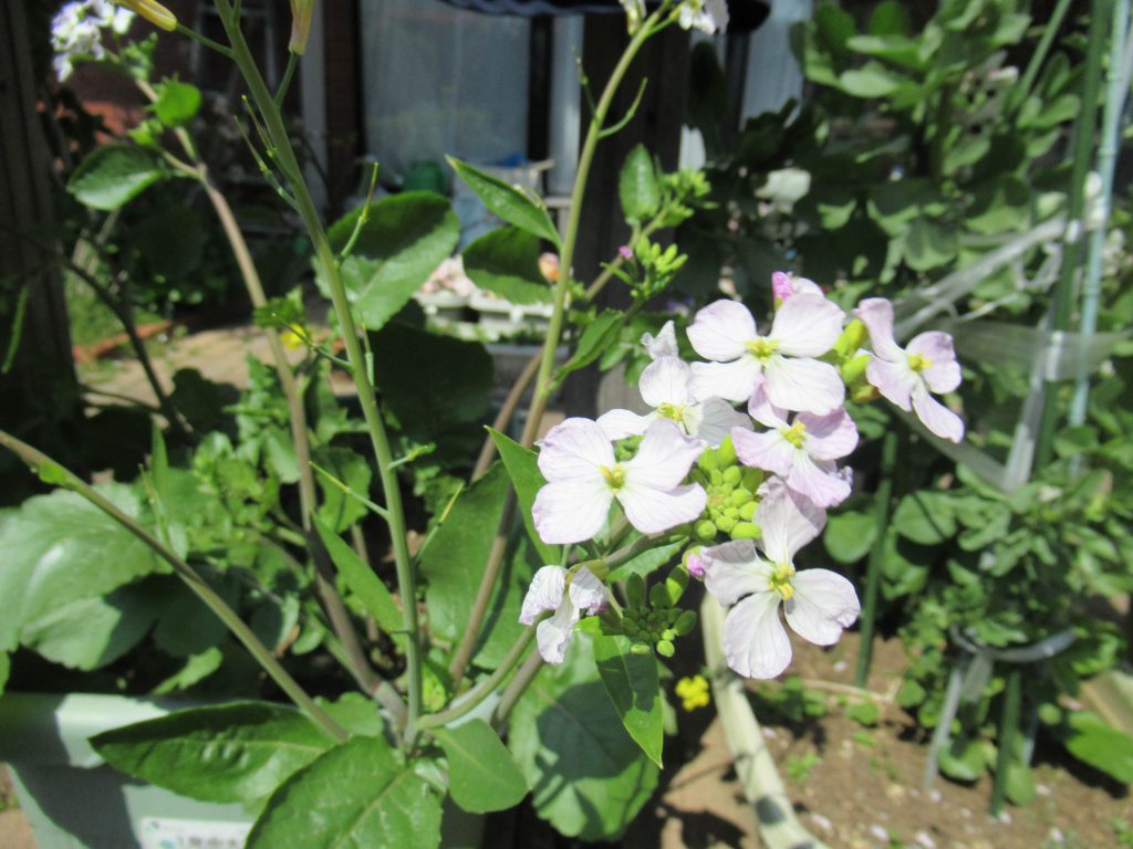 隣の白い花は去年育てた春菊!種が落ちていたんですね。