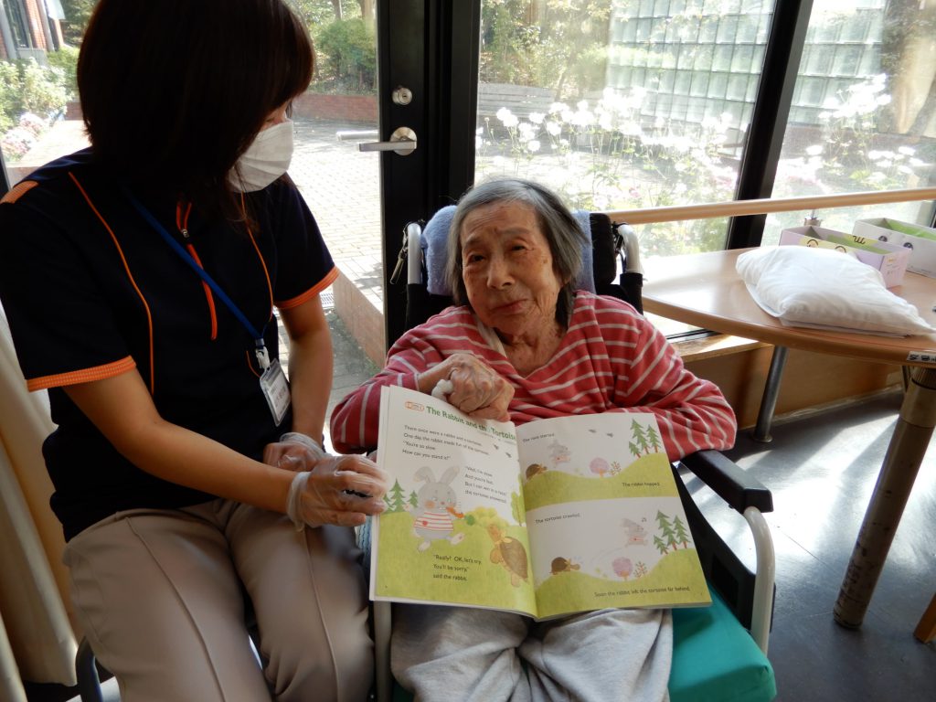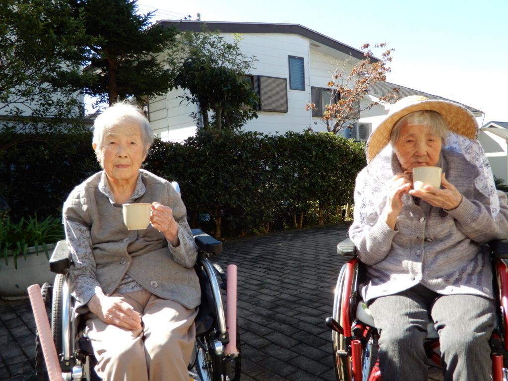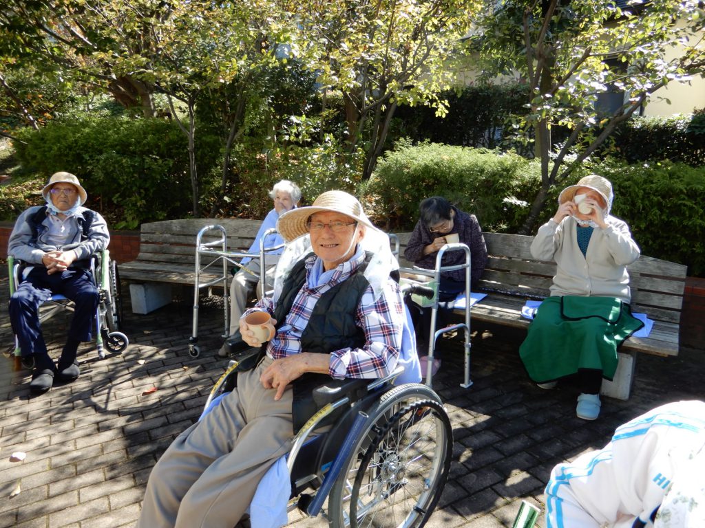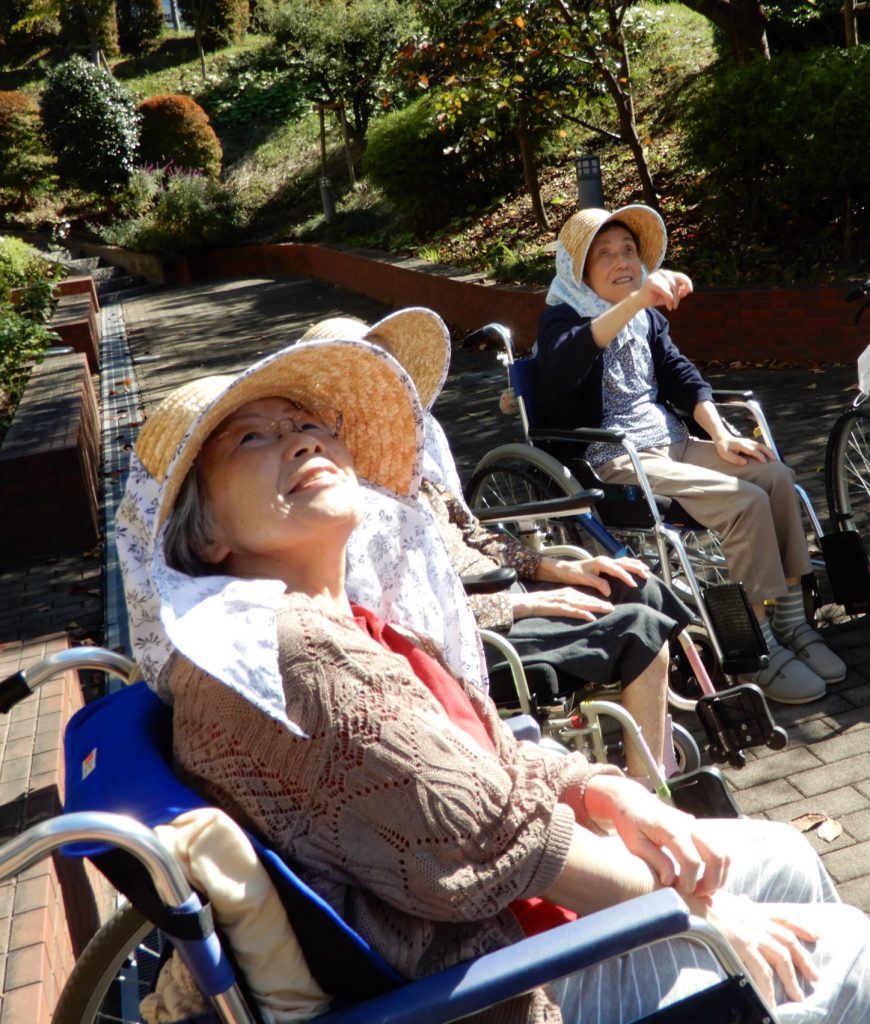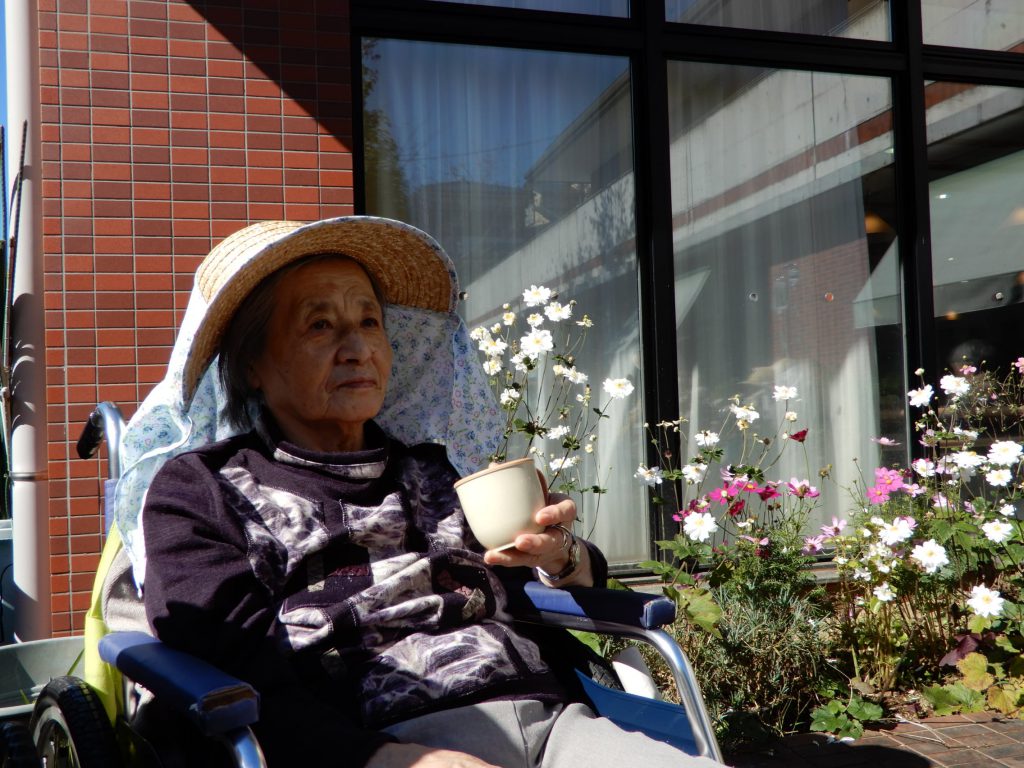 リハビリの時間以外にも介護士によるレクリエーションの時間もあり、天気のよい日には庭に出て、日光浴をしながら体操をしたり、お茶を飲んだりして過ごすこともあります。