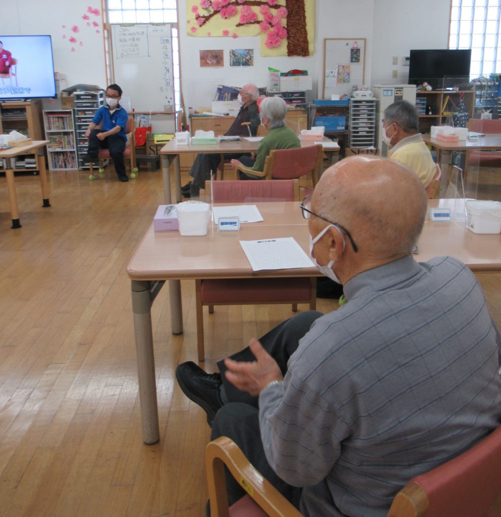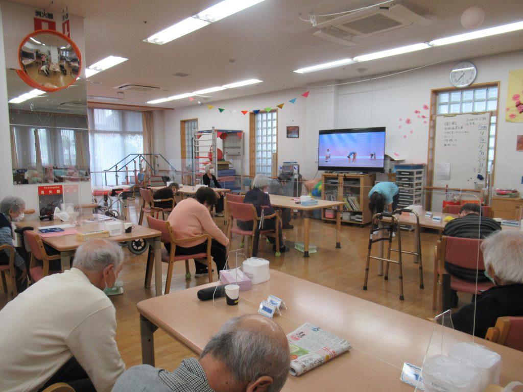 職員による体操のほか、DVD、カラオケ機器、YouTube等を駆使し、ご利用者様が興味