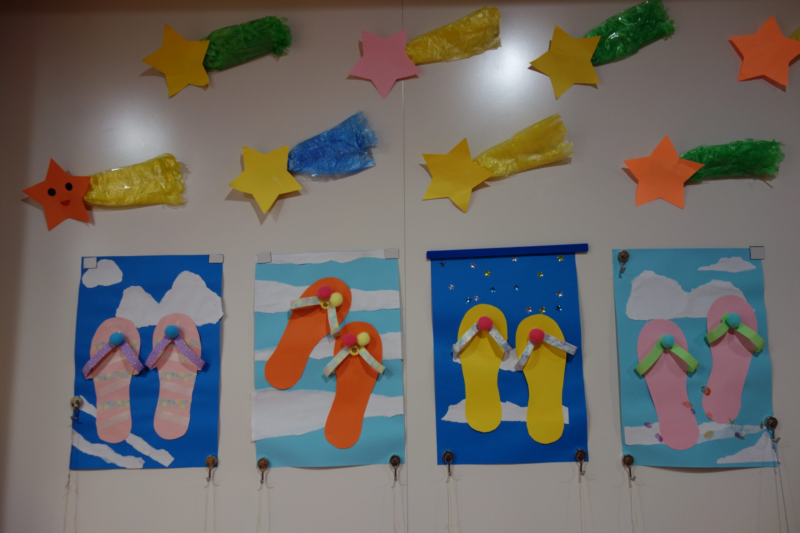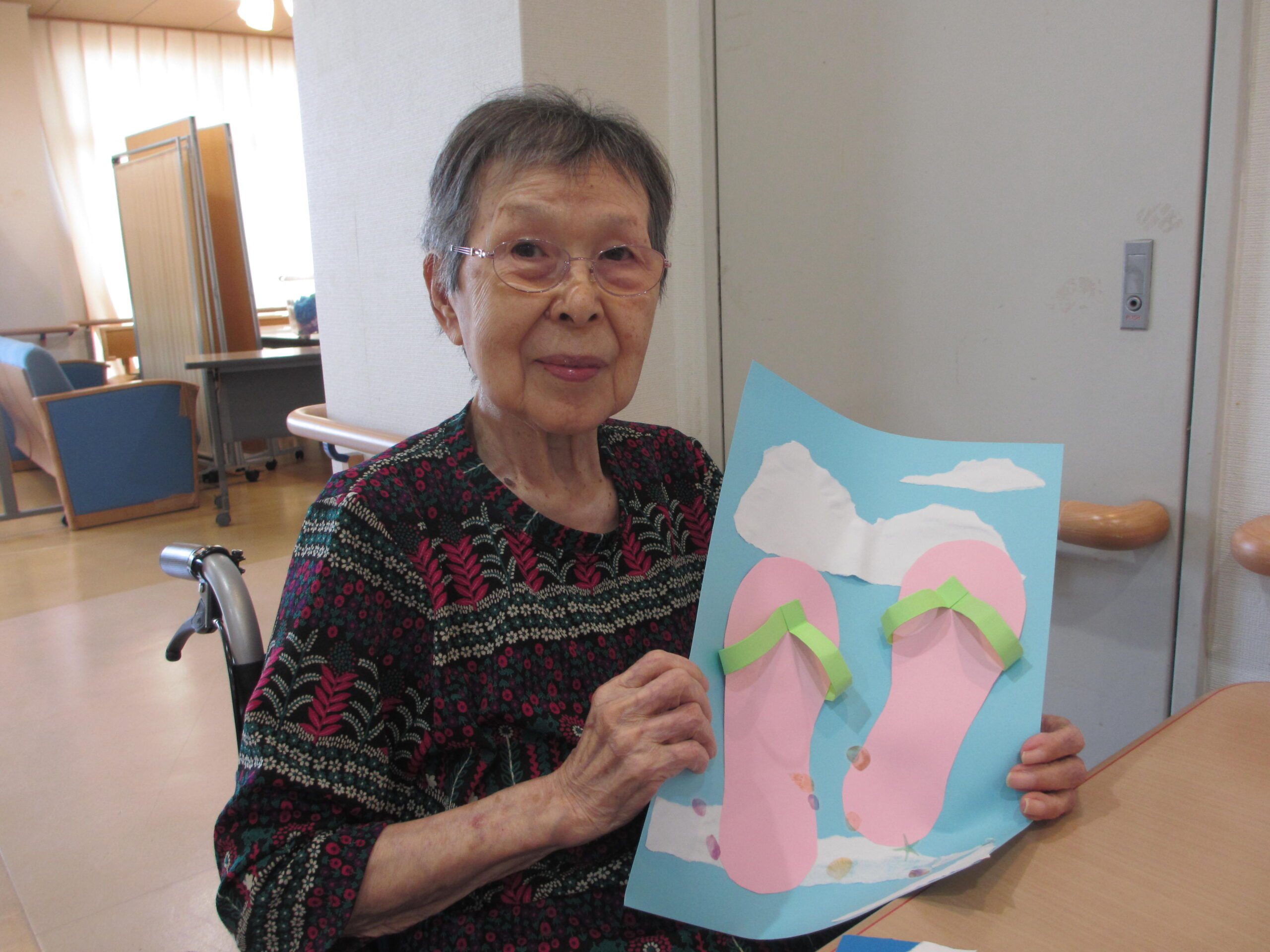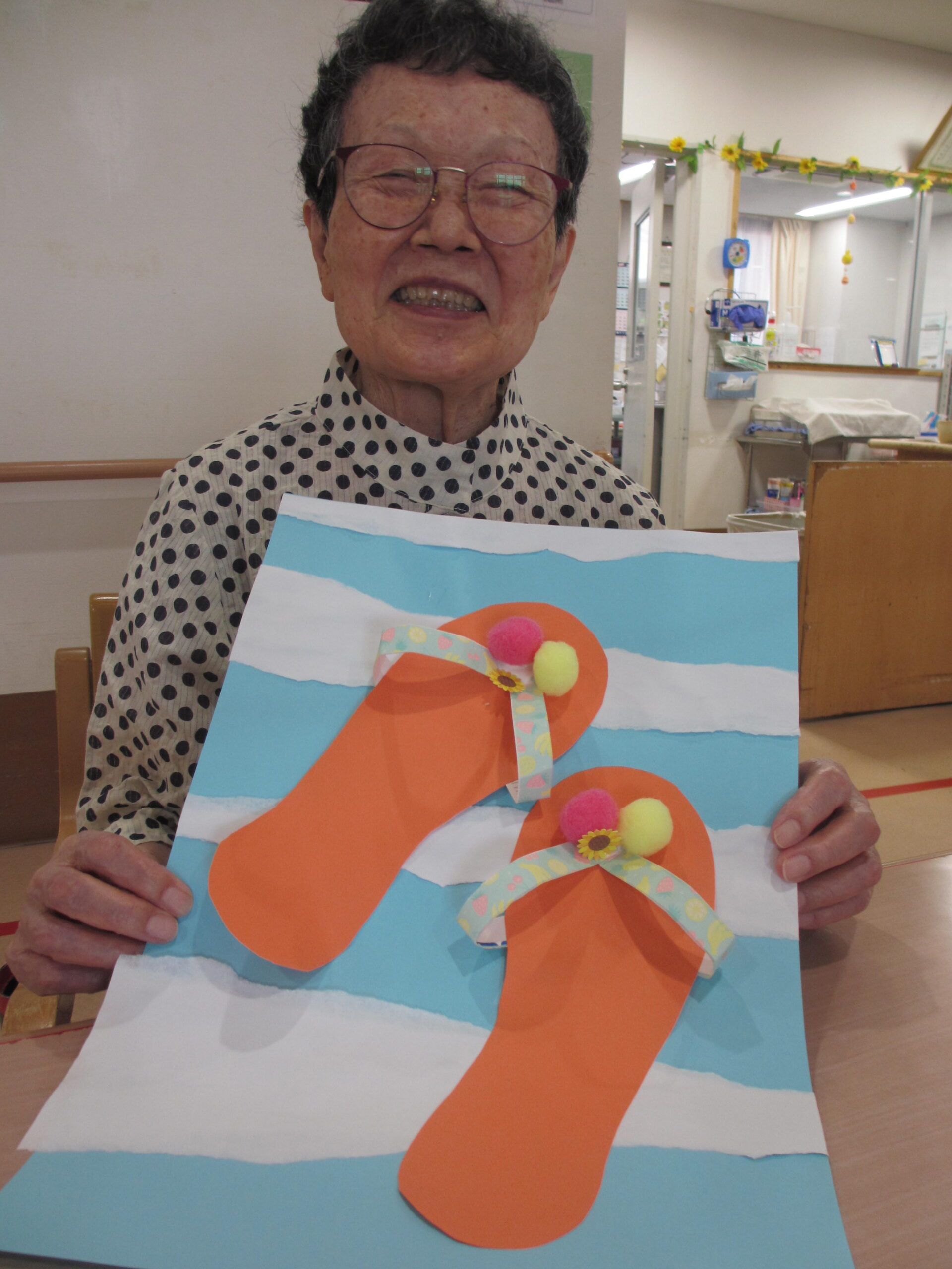 若葉が丘では入所中も夏を感じてもらえたらとご利用者様とサンダル飾りの製作を行いました。