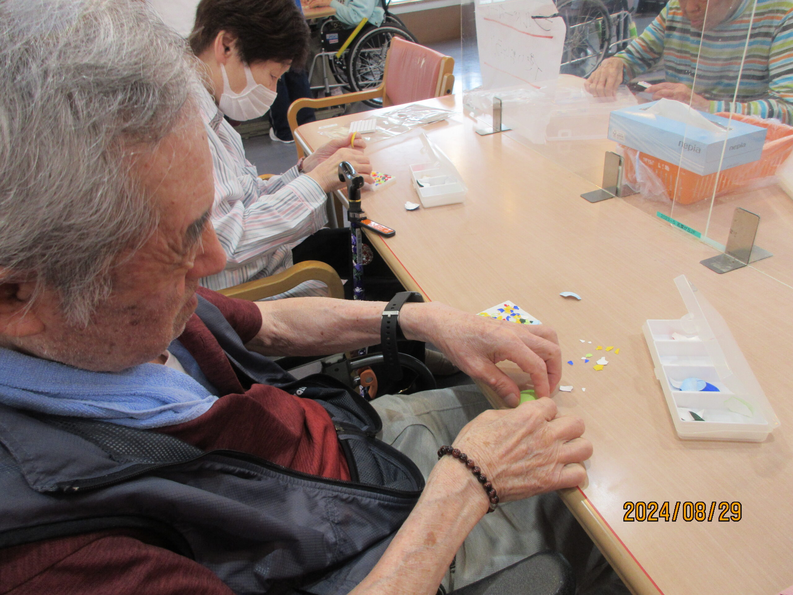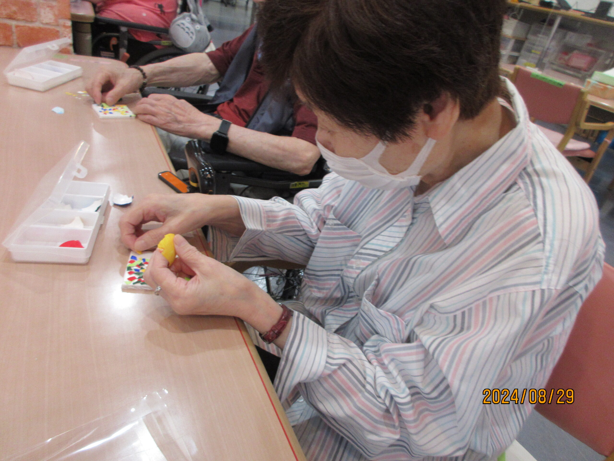 現在2階では毎週金曜の制作レクリエーションで卵の殻を使ったモザイクアートを行っています。
