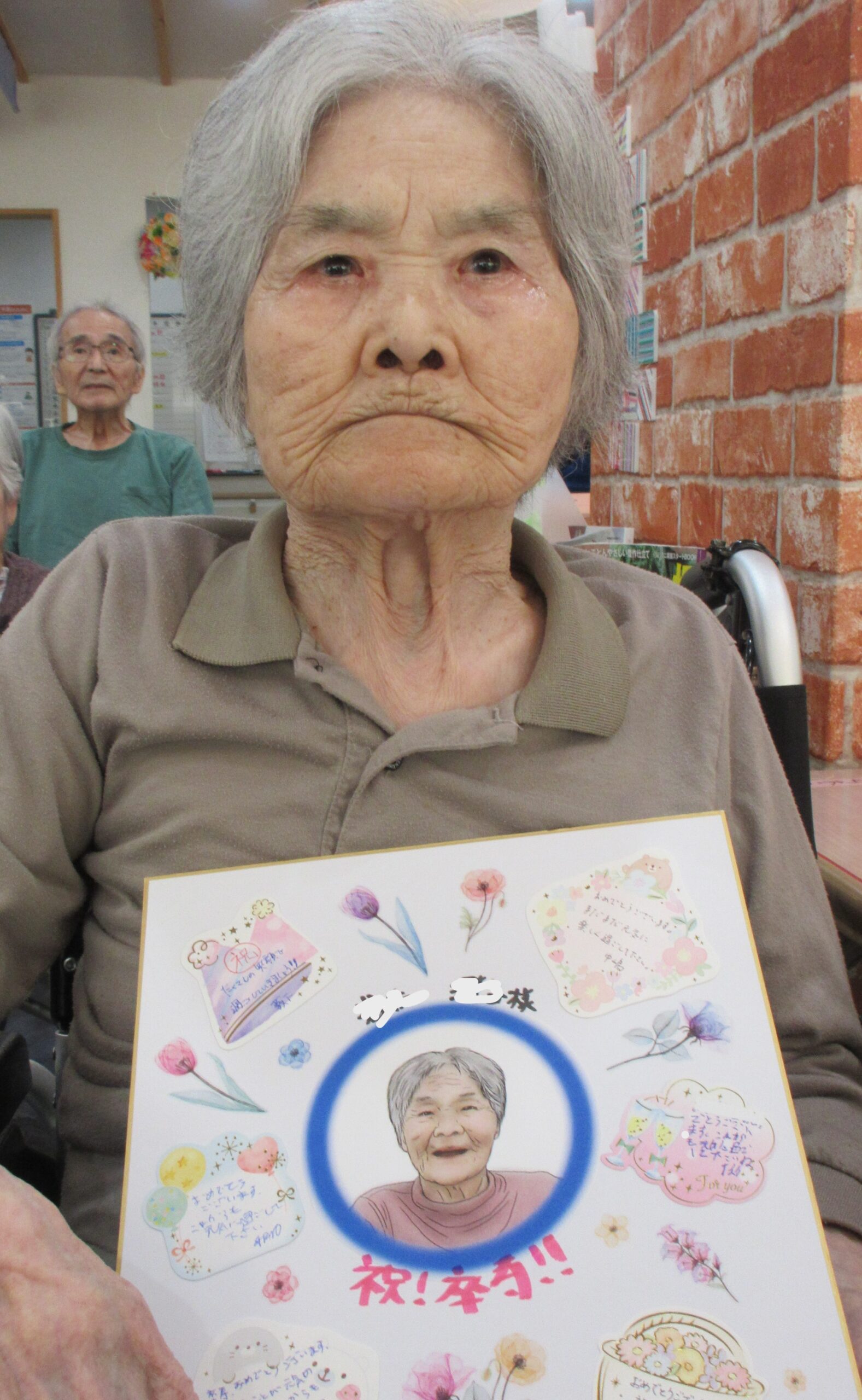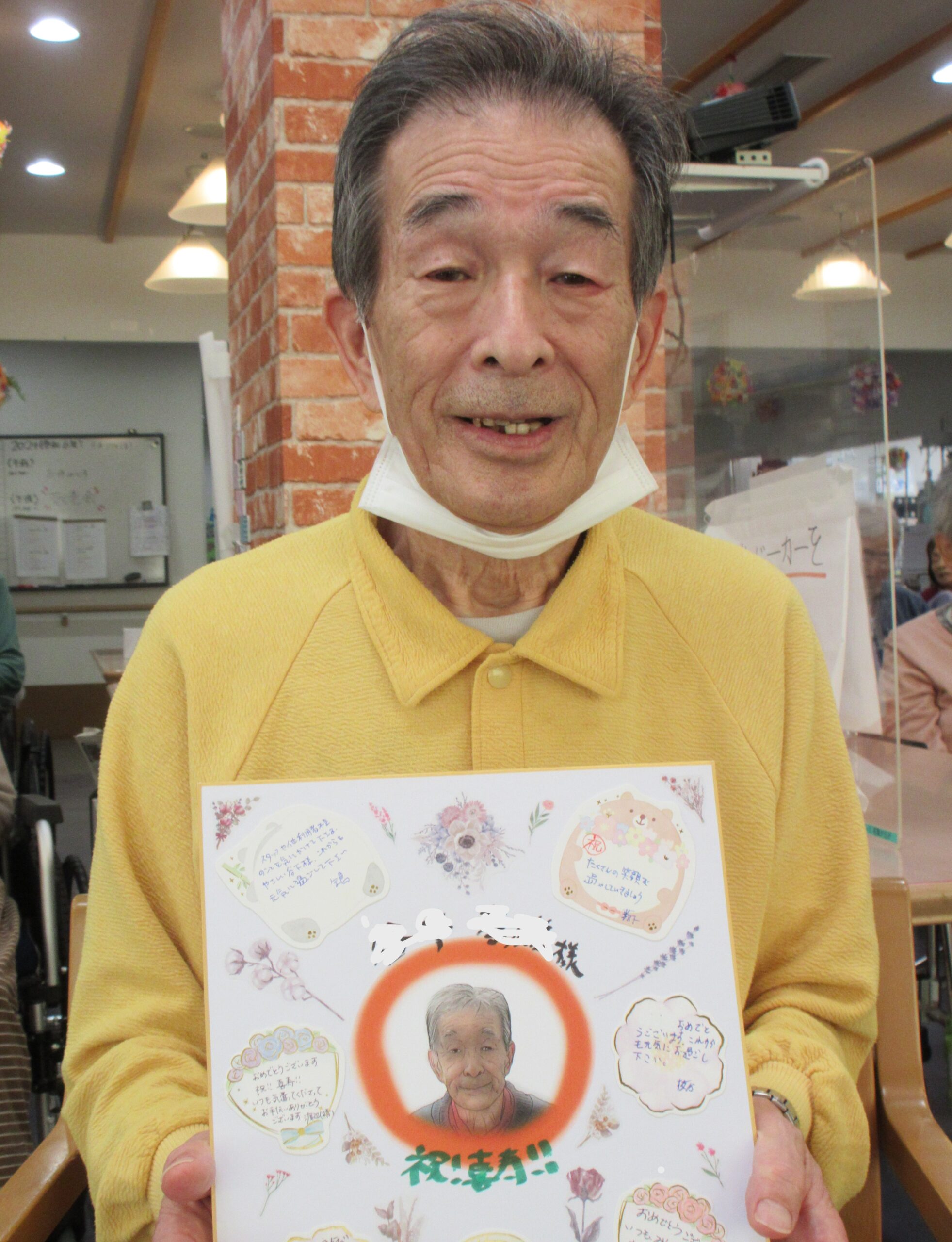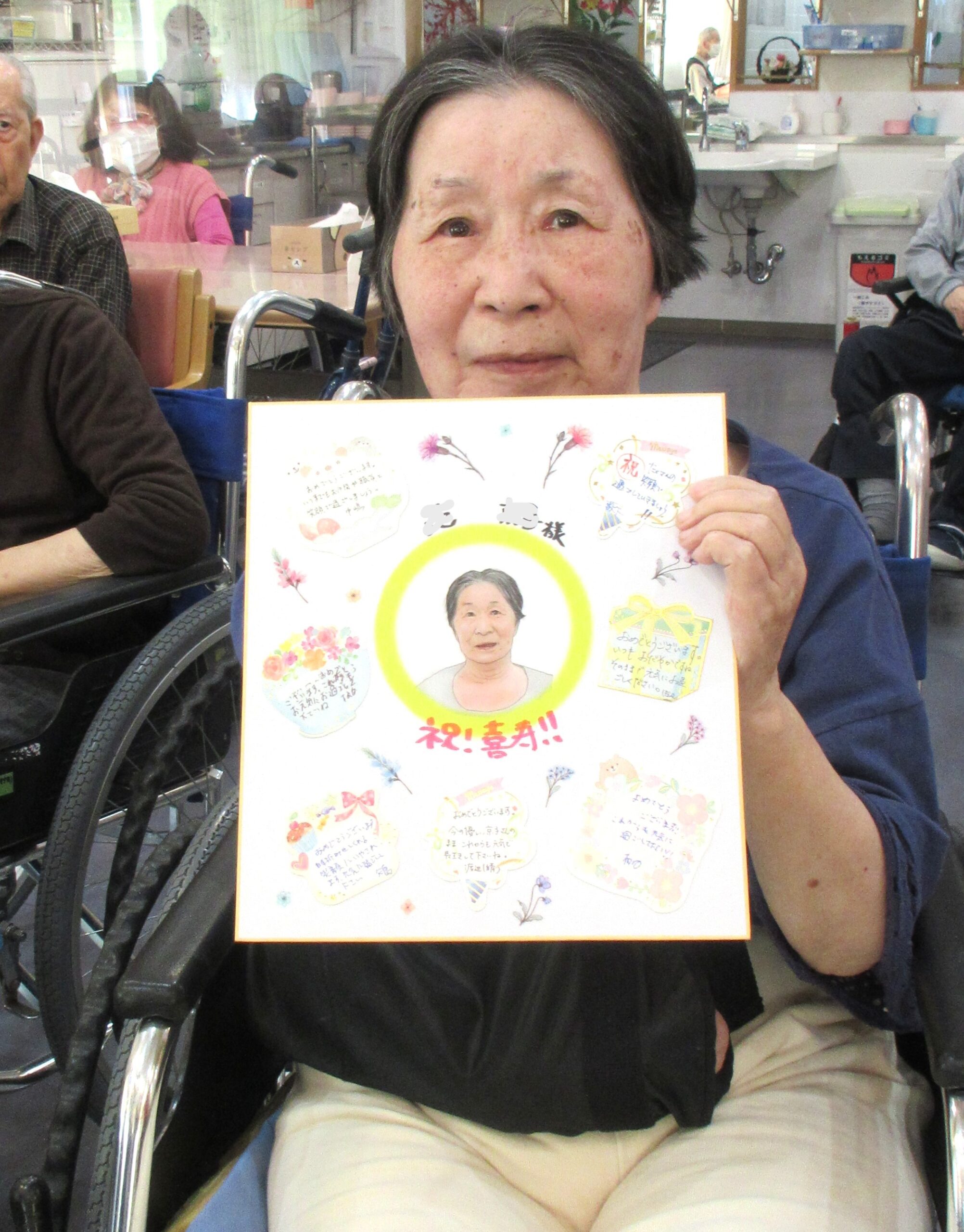 今年は喜寿(77歳)・傘寿(80歳)・卒寿(90歳)・白寿(99歳)の方がいらっしゃり、それぞれに職員より色紙を送りました。
