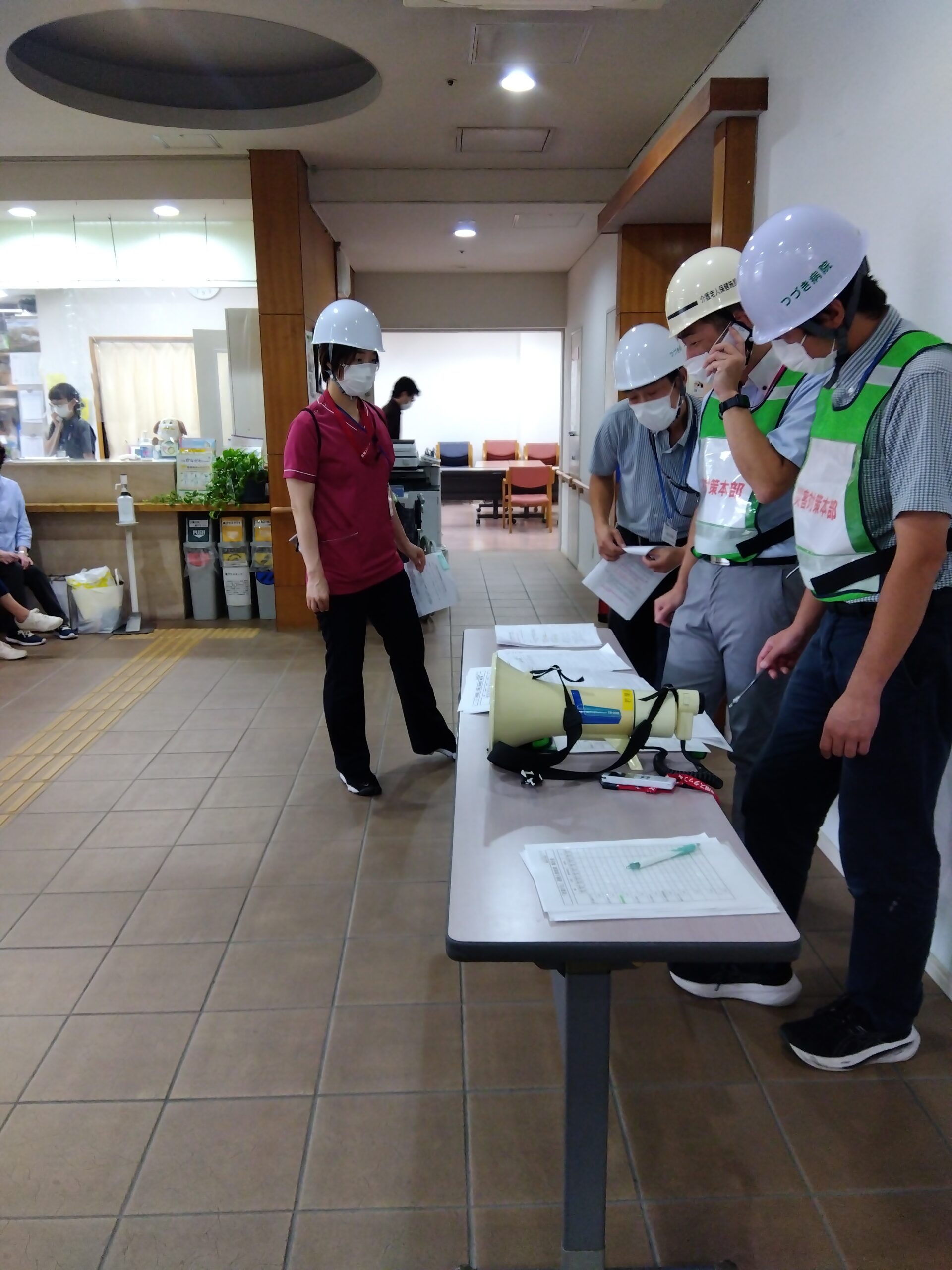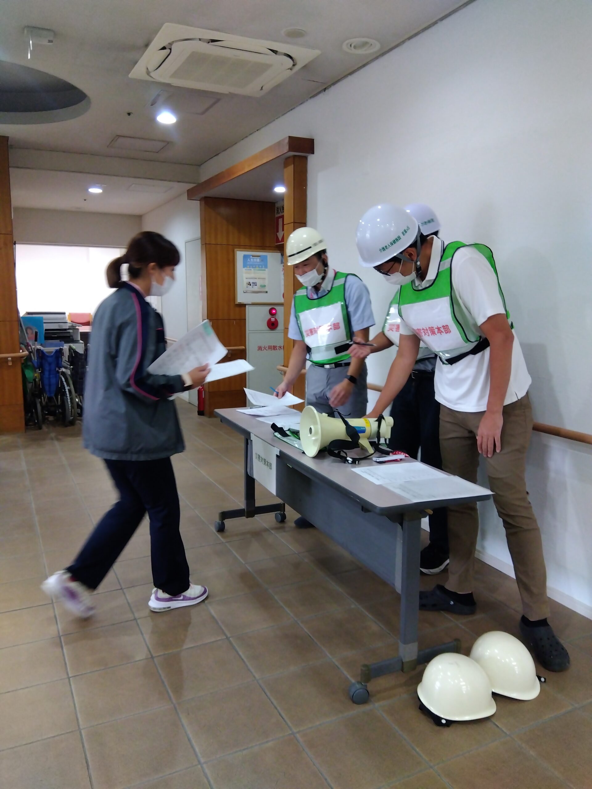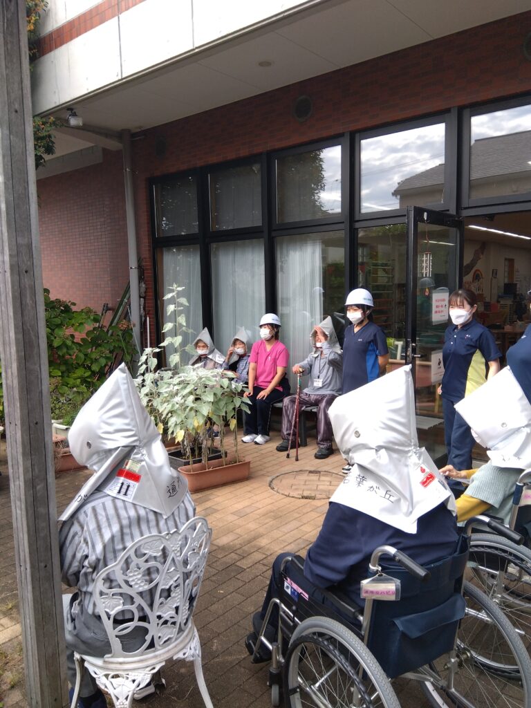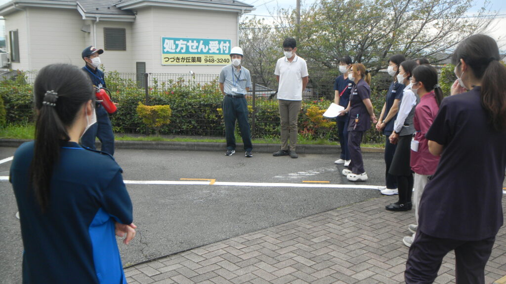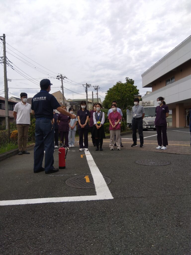 防災訓練では災害時に適切な行動をとるために、災害を想定して行う事前訓練です。防災訓練は、従業員や通所リハビリ利用者様や入所利用者様の身の安全を守り事業存続を図るために、事前の防災対策が欠かせまません。