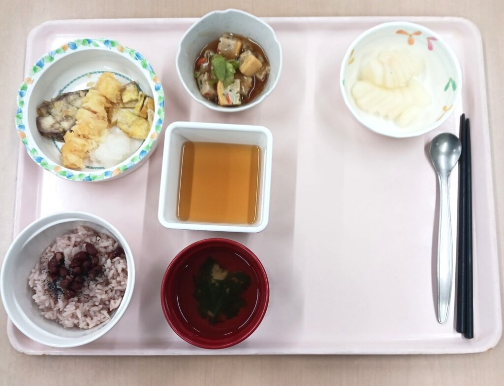 メニューはお赤飯・天ぷら(エビ・サツマイモ・ナス)・五目豆腐のあんかけ・すまし汁。