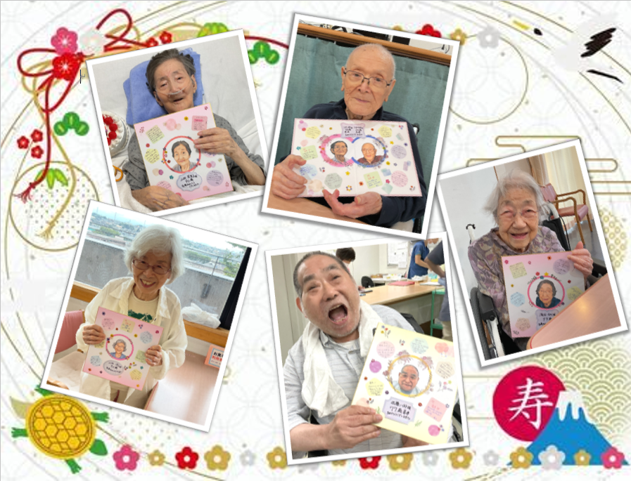 おやつには苺と抹茶のムースケーキを贅沢に二種類と紅茶をお出しし皆様に味わっていただき、賀寿を迎えられた方には、職員が手描きしたご利用者様の似顔絵と、お祝いコメントの寄せ書き色紙をプレゼントしました。