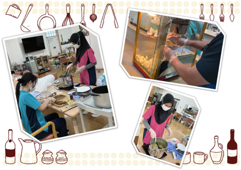 インドネシア人の職員が朝の9時から4時間かけて作ったブブル・カチャン・ヒジャウという緑豆のココナッツミルク煮と、パーティーに欠かせない出来立てのポップコーンをご用意。
