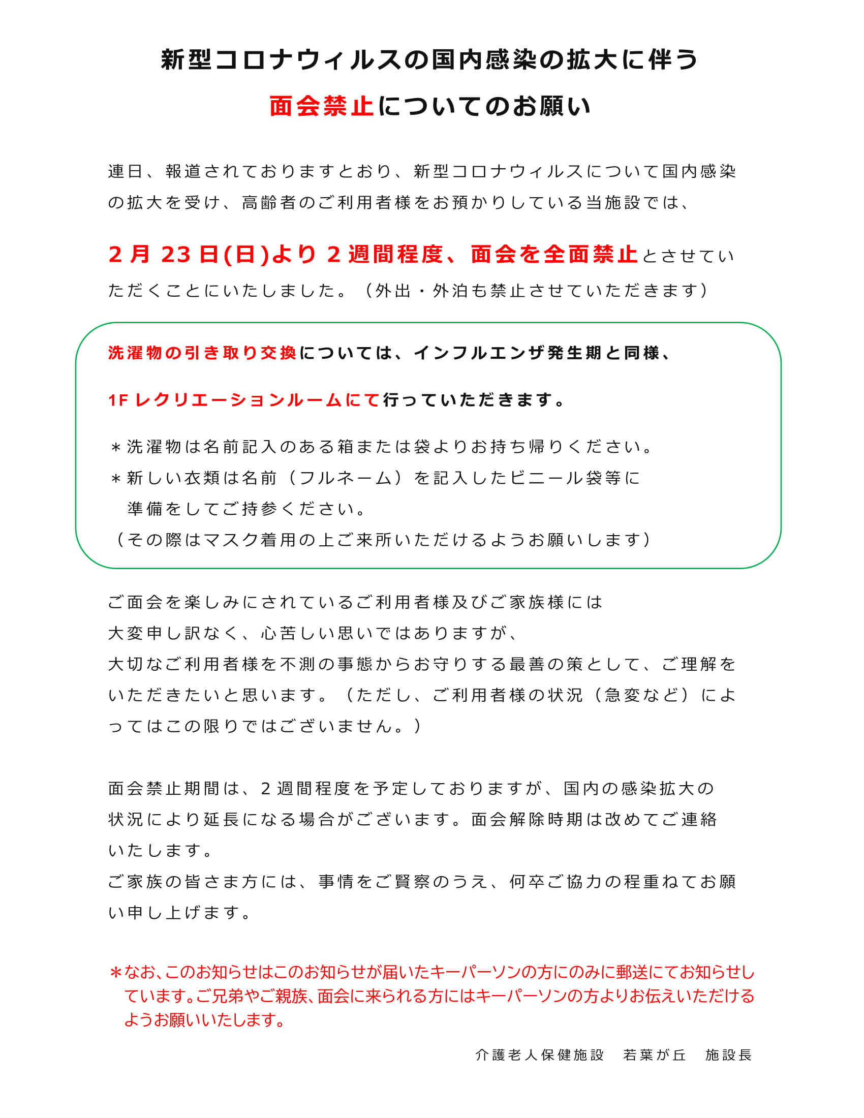 【若葉が丘】新型コロナウィルスの国内感染の拡大に伴う面会禁止についてのお願い