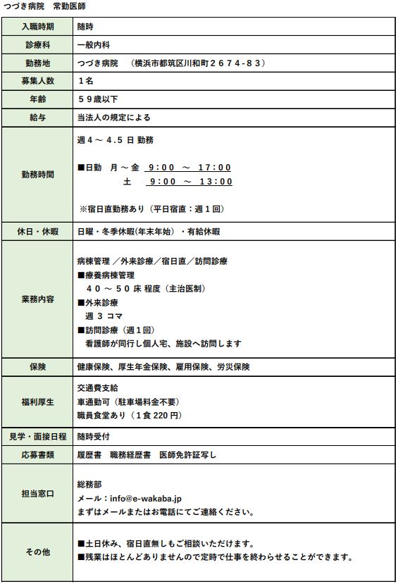 医療法人社団若葉会では、つづき病院の 医師(常勤) を募集しています。